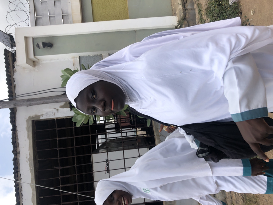 The image displays two young women walking along an unpaved path in Adonkolo, Nigeria. The woman in the foreground, of dark complexion, wears a white hijab, a white long-sleeved top with teal cuffs, and a black shoulder bag. Her lips are coated with light orange lipstick, and her tongue is slightly extended. Behind her, a second woman, partially visible, wears a white hijab and a similar white top with teal cuffs, featuring a green emblem on the chest; she is smiling broadly. The background on the left features a weathered, light-colored building with a dark, grilled opening through which a "MIKANO" logo is discernible. On the right, a two-toned concrete fence (light green and yellow) is visible, topped with coiled barbed wire, and includes a wall-mounted light fixture. The ground is composed of dirt and sparse vegetation, beneath a partly cloudy sky.
