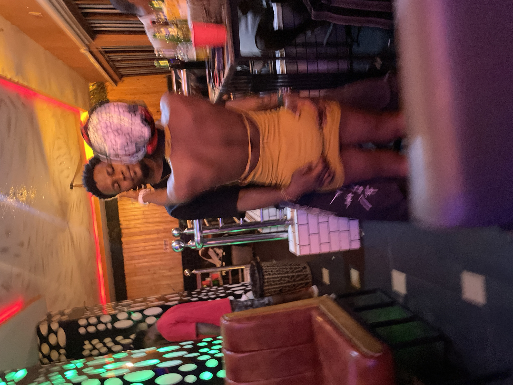 Here is a description of the image: The image appears to be taken inside a bar or nightclub. A shirtless man wearing yellow shorts and a red and white patterned cap is the main subject. He is being embraced or held by another man wearing a black shirt. The background features a lit bar with bottles, tables, and a seating area with red cushioned chairs and a table with an illuminated pattern. There is also a small drum or similar instrument visible. The location is likely Obosi, Nigeria.