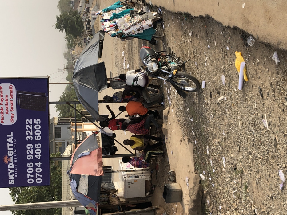 The scene depicts a roadside gathering in Karu, Nigeria, characterized by an informal commercial or social hub under bright daylight