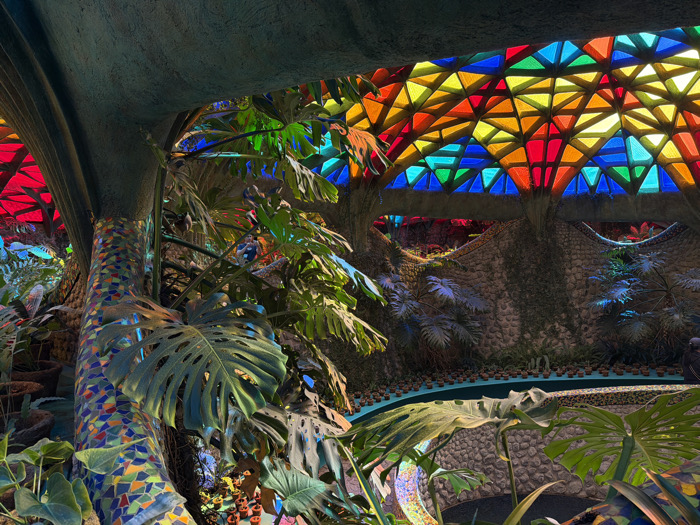 A vibrant mosaic of triangular stained glass panels illuminates a lush indoor garden