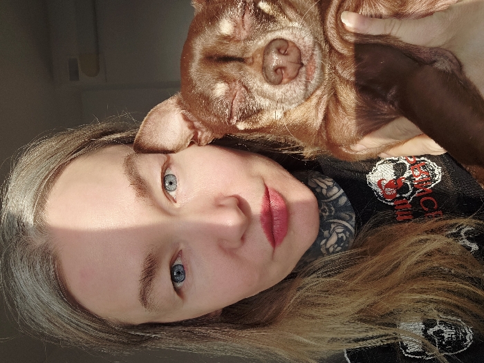 - "The image presents a close-up indoor portrait of an adult female holding a small dog, taken in Saint Petersburg, Russia" by FM-Uibel2, licensed under CC BY 4.0