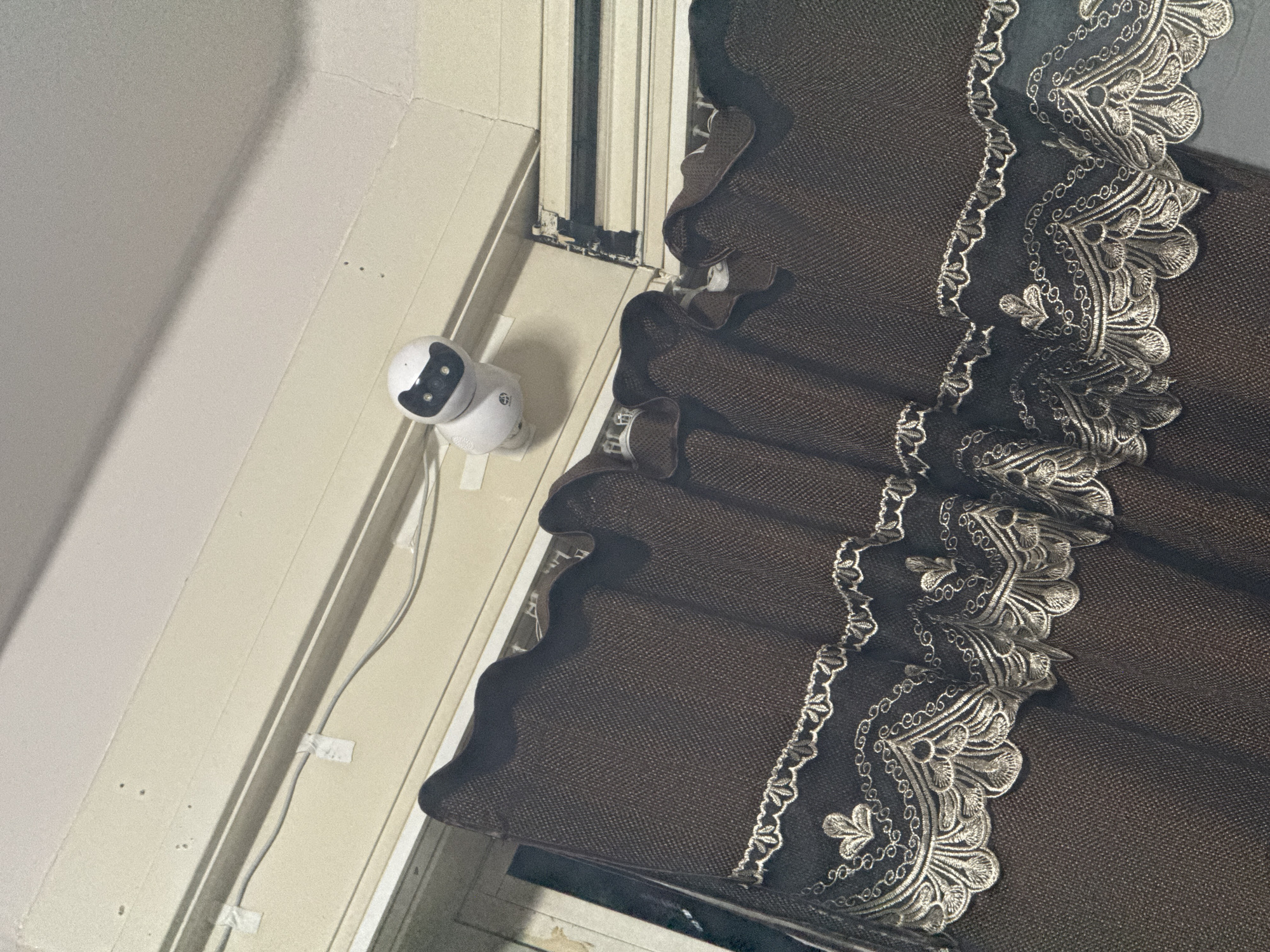 The image displays an interior scene, primarily focused on a security camera mounted near a ceiling and a section of decorative curtains. **Location:** The specific location within the city of The Hague, Netherlands, is not ascertainable from the visual information presented in this image. **Scene Description:** A white, spherical security camera with a black, cat-like faceplate (depicting two eyes and a nose/mouth area) is affixed to a light-colored wall near the ceiling. The camera is oriented slightly downwards and towards the left. A thin, white power cable extends from the camera's base, running horizontally along the wall, secured by three visible pieces of white adhesive tape or clips. The wall itself is painted a cream or off-white color. Above the wall, a flat, light-colored ceiling is visible. Below the camera and wall section, a window or sliding door frame is partially visible, featuring a horizontal track system. Hanging beneath this frame are dark brown, textured curtains. The lower portion of the visible curtain features an intricate, multi-layered decorative trim in a light, possibly silver or beige, embroidered pattern. This trim includes scalloped edges, interwoven chains, and stylized leaf motifs, creating a complex, ornamental border. No people are present, and no active interactions or actions are depicted. The scene appears to be an interior domestic or office setting.