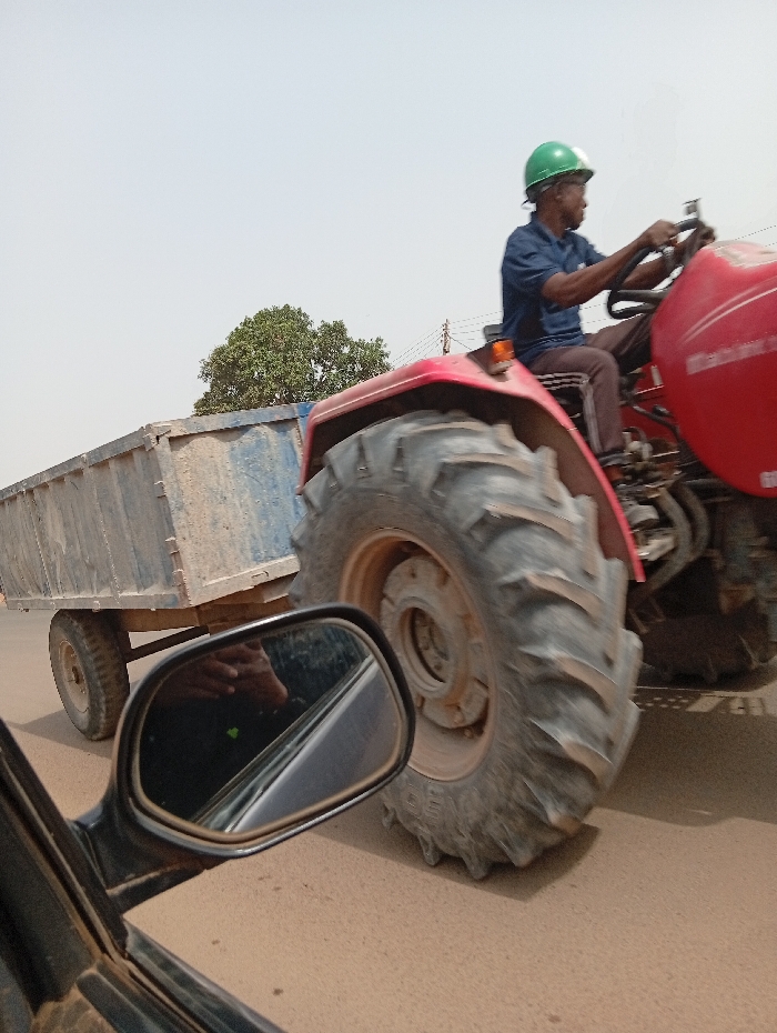 - "A red tractor with a partially visible "Mahindra" logo is observed moving right-to-left on a light brown paved road in Peyer, Nigeria" by FM-pinCd2, licensed under CC BY 4.0