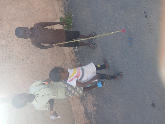 Three individuals are depicted standing on an asphalt surface in Jos, Nigeria, against a light brown textured wall. On the left, a young female, wearing a light collared shirt and patterned skirt with blue sandals, holds a white plastic object in her left hand and an orange-tipped stick in her right. In the center, a young girl, dressed in a white striped t-shirt, dark leggings, and brown sandals, looks towards the ground. On the right, a young boy, wearing a brown polo shirt and dark shorts with dark sandals, holds a long, light-colored stick. The stick's end, featuring a red circular attachment, rests on the asphalt. A small blue dumbbell-shaped toy is on the ground between the children. Green foliage is visible at the base of the wall on the right. The scene is lit by natural daylight.