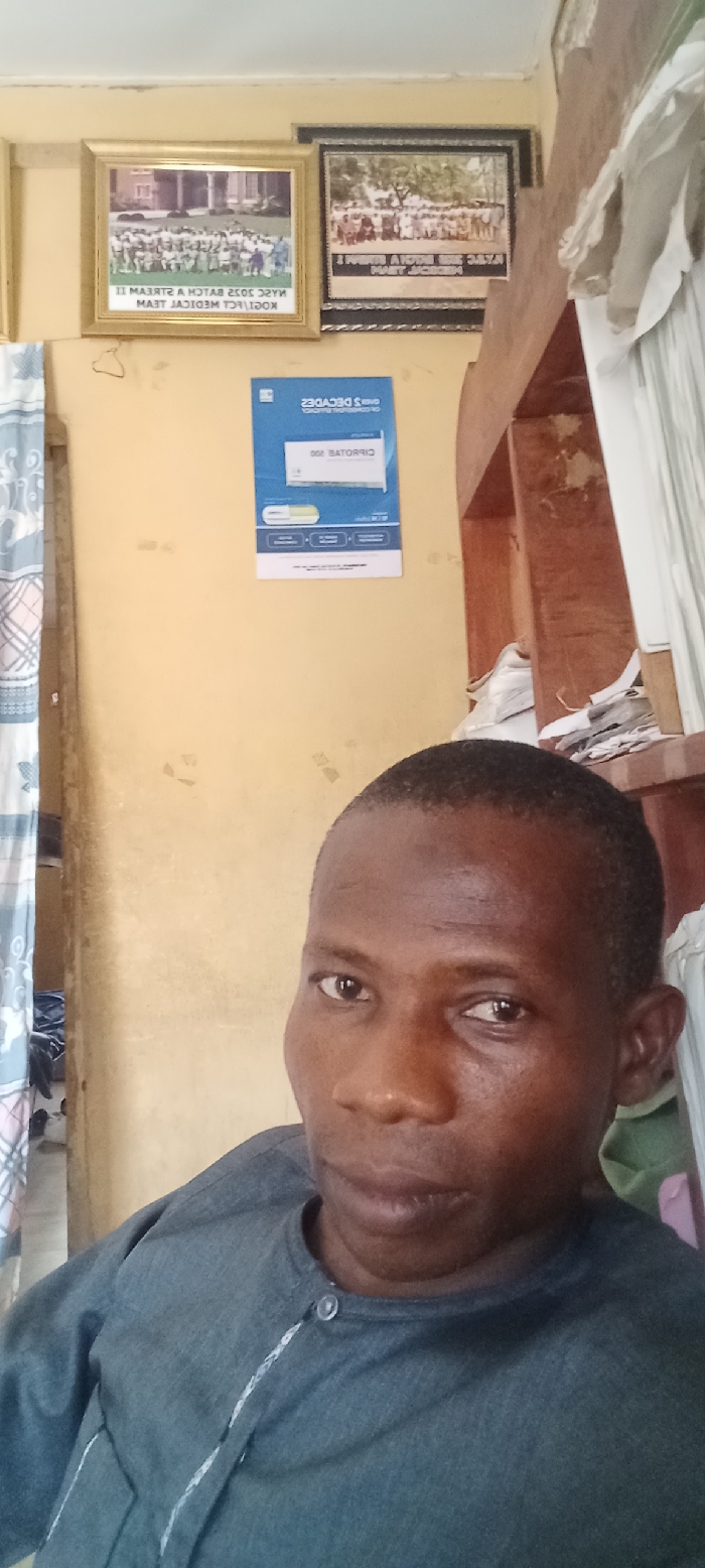A man with short hair and dark skin poses for a selfie. He wears a gray shirt with a button near his left shoulder. Behind him is a yellow wall with two framed pictures and a medical advertisement poster. A shelf filled with paperwork is visible on the right. A striped curtain hangs on the left. The lighting in the room is soft, casting subtle shadows on the man's face.