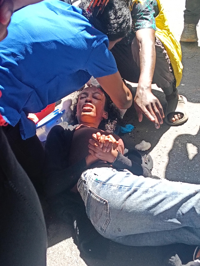The image depicts an outdoor scene on a grey paved surface, during daylight with strong shadows, consistent with an urban environment in Nairobi, Kenya. A female individual with dark, curly hair is lying supine on the ground. She is wearing a dark long-sleeved top and light blue denim jeans. Her face is covered in blood around the nose, mouth, and forehead. Her eyes are closed or squinted, and her mouth is open. Her hands are clasped together across her chest. Two individuals are positioned around her. One individual, wearing a bright blue short-sleeved top and dark trousers, with dark hair styled with orange/red accessories, is leaning over the head and upper body of the supine individual, appearing to attend to her. A second individual, wearing a multi-colored long-sleeved shirt, a yellow vest, dark trousers, and open-toed sandals, is crouched adjacent to the first attendant, observing the scene. On the ground near the supine individual's left side, a partial view of a blue and red plastic container is visible. Small, white, irregular objects and a crumpled blue fabric item are present on the ground near her head. Portions of other individuals are visible in the immediate background and foreground, indicated by a leg in dark clothing and another in beige boots.