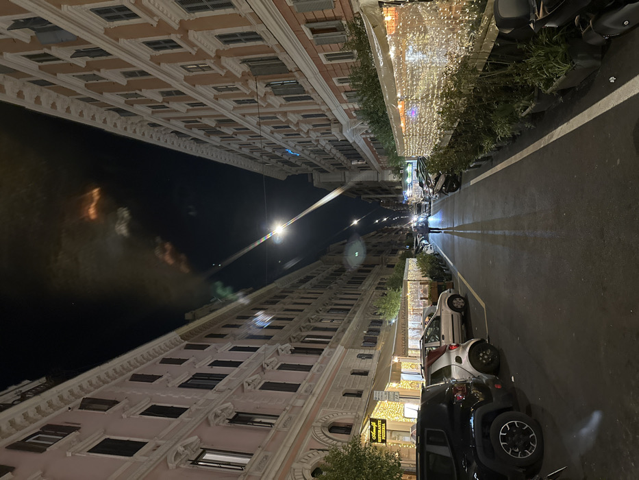 A nighttime street scene shows buildings on either side, lit by streetlights. One side is adorned with strings of lights. Cars and scooters line the curb along the right side of the frame. The street appears wet and reflective. The sky is dark, with faint light and what seems to be light reflecting off clouds or fog. The perspective is a long shot down the length of the street.