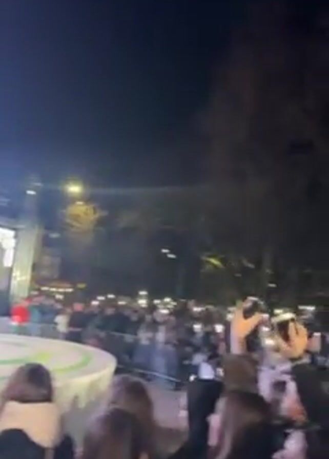 nighttime outdoor concert from the perspective of someone in the audience. A stage with lights and a large screen is visible at the front. A crowd of people are standing closely together, many holding up their phones to record the performance. Trees are visible behind the crowd.