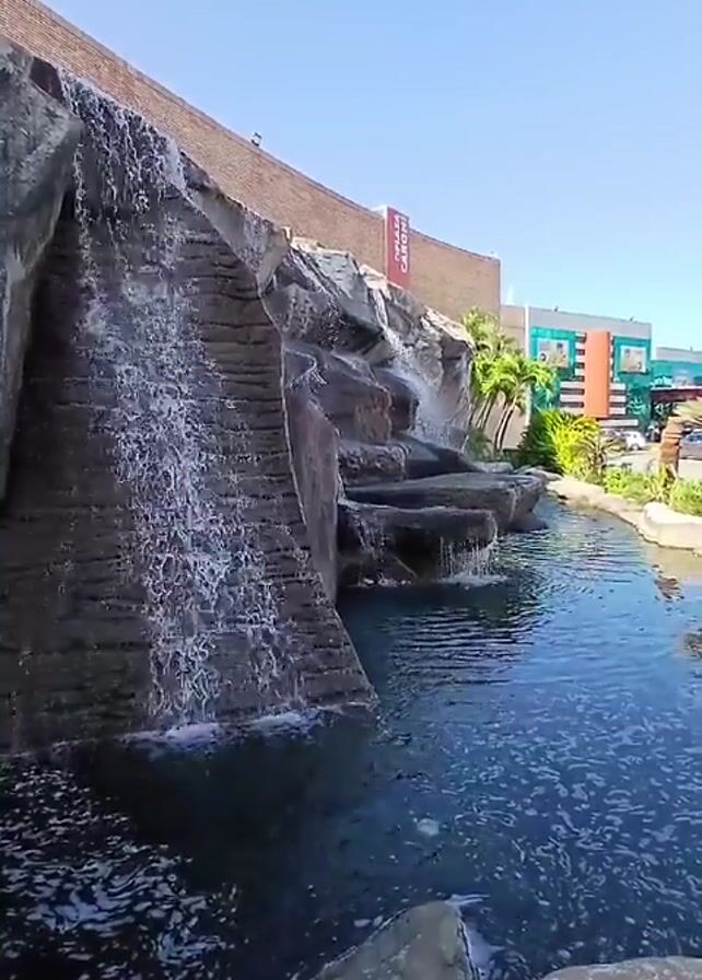 landscape featuring a man-made waterfall cascading into a pond. The waterfall is constructed from grey rocks that resemble steps. The pond is surrounded by similar rock formations and some greenery, including what appears to be a palm tree. In the background, there is a building with a sign that reads "COZZA CARONI". The sky is clear and blue. The camera is positioned at a low angle, looking up at the waterfall. The water is flowing steadily, creating ripples on the surface of the pond. There are no people visible in the video. The overall scene presents a serene and artificial landscape.