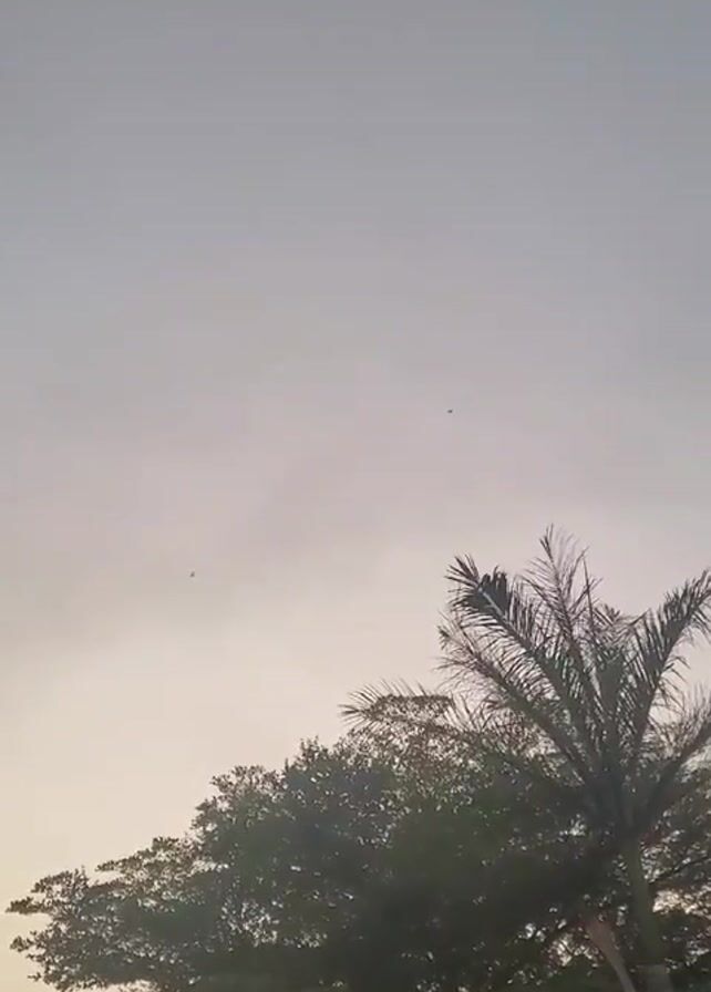 The video presents a wide shot of the sky, partially obscured by treetops. The sky appears overcast with a pale, grey hue. In the lower portion of the frame, there's a mix of dense, green foliage from various trees, including a palm tree on the right side of the frame. Several small, dark specks—possibly birds—are visible in the sky. The video appears to be taken at dusk or dawn, considering the soft, muted lighting. There is indistinct conversation audio in the background.