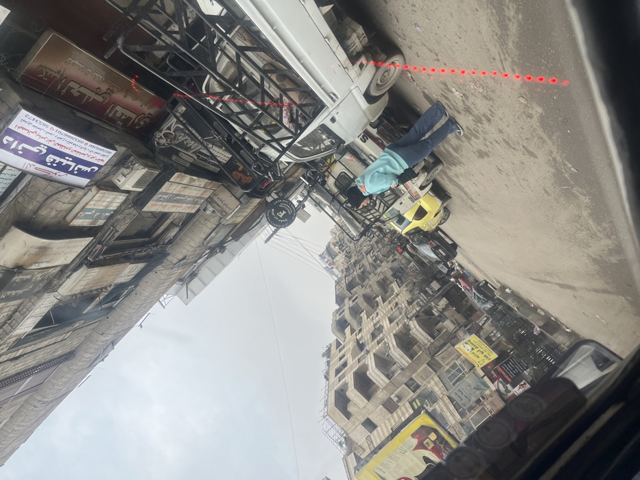 An urban street scene shows dense buildings with multiple levels and intricate facades. Signs with Arabic script are prominently displayed on the buildings. A person in a blue top stands near a vehicle parked on the road. Wires stretch across the sky above the street. The image seems to be taken from inside a vehicle. Overall, the image captures the crowded and bustling atmosphere of a Middle Eastern city street.