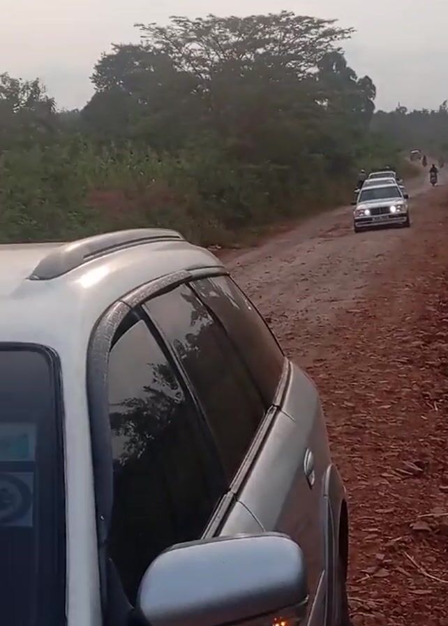 convoy of cars driving down a red dirt road in a rural area. The camera is positioned from inside a parked silver car, focusing on the side mirror and back windows. The convoy consists of several white Mercedes-Benz cars, followed by a motorcycle and another SUV. The road is unpaved and appears to be somewhat rough. On either side of the road, there's vegetation, including trees and shrubs. The sky is overcast, suggesting it's either early morning or late afternoon. There's some conversation happening but it is not clear.