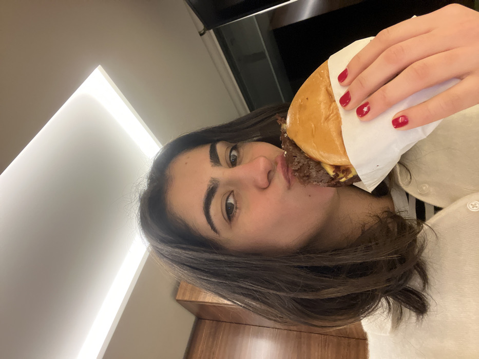 - "A young woman holds a large burger wrapped in white paper near her mouth" by FM-t80Kg1, licensed under CC BY 4.0