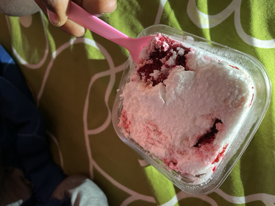 The scene depicts a dessert in a clear plastic rectangular container resting on a green fabric surface with a white curvilinear pattern, illuminated by a strong light source casting sharp shadows. The dessert consists of a red base topped with a white, granulated, somewhat uneven layer, suggesting a partially consumed item. A brown-skinned hand is visible on the right, holding a pink plastic spoon inserted into the red portion of the dessert. In the out-of-focus upper left, a blue garment and a white object, possibly a sleeve or blanket, are visible, indicating the presence of at least one other individual or body part. The event is located in Narayi, Nigeria.