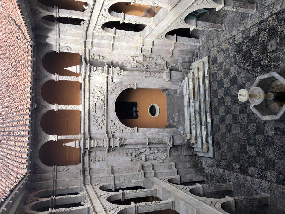 The photograph depicts a courtyard from above. The architecture features multiple levels with arched passageways. Carved stone ornamentation adorns the structure. A tiled roof section is visible on one side. The courtyard floor exhibits a checkered pattern, punctuated by an octagonal fountain with a central water feature. The interior walls of the building display a warm, orange hue, contrasting with the gray stone of the exterior. A circular window is visible in one of the orange walls.