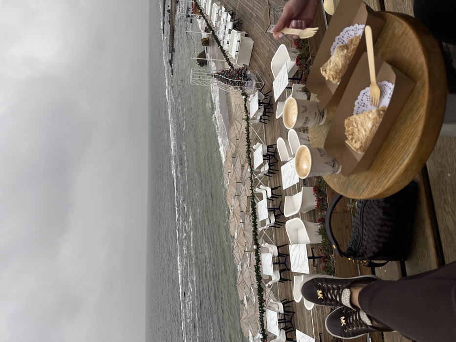 A scene overlooking a sea and beach, featuring a table with two coffees and pastries in boxes. Tables and chairs line the boardwalk along the beach. A person's legs are visible in the foreground, wearing sneakers. A black woven handbag sits next to the shoes. The sky is overcast and the sea is gray.
