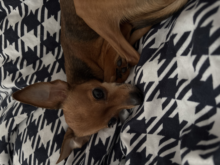 A small, short-haired dog with reddish-brown fur, large erect ears, and prominent dark eyes is depicted resting on a textile surface