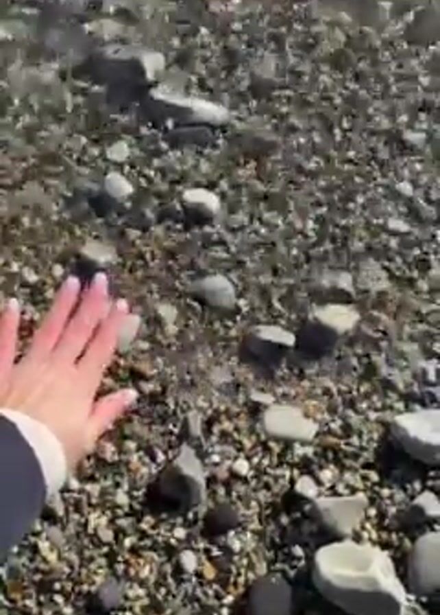 hand interacting with water on a rocky beach. The hand has pale skin and manicured nails. It reaches out and touches the water as it washes over the pebbles and larger rocks on the beach. The water is clear and shallow, and the rocks are various shades of grey and black. A small portion of a blue and white jacket sleeve is visible in the lower left corner of the frame. The beach appears to be sunlit.