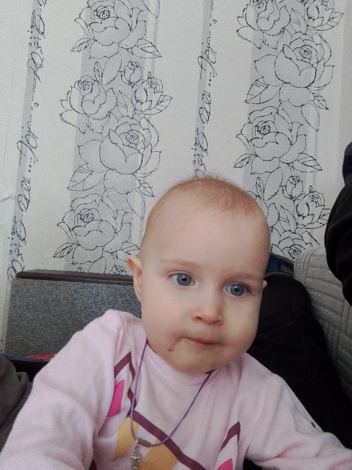 The scene, located in Kuyeda, Russia, features a Caucasian infant, likely a toddler, positioned centrally in the frame. The infant has fair skin, sparse light-colored hair, and blue eyes, with a dark smudge visible on the lower right cheek near the mouth. The infant wears a long-sleeved light pink shirt adorned with white snap buttons on the left shoulder and a geometric pattern in maroon and peach tones across the chest. A slender purple cord necklace with a small, light-toned, possibly metallic pendant (resembling a stylized cross or key) is worn around the neck. The infant's mouth is slightly pursed, and the gaze is directed forward and slightly to the viewer's right. The background consists of light-toned wallpaper with a repeating pattern of vertical stripes. These stripes alternate between columns of stacked, dark-outlined rose motifs and columns containing abstract, dark-lined script or decorative elements. The wallpaper exhibits minor wear, including some discoloration and slight peeling in areas. To the infant's left, a section of a dark grey, textured furniture surface (e.g., an armrest or headboard) is visible, topped by a darker, flat, horizontal surface. To the infant's right, partial views of dark clothing and a light grey, textured fabric surface are discernible, suggesting the infant is seated or held in proximity to another person or a piece of furniture. No direct interaction with other individuals is explicitly depicted.