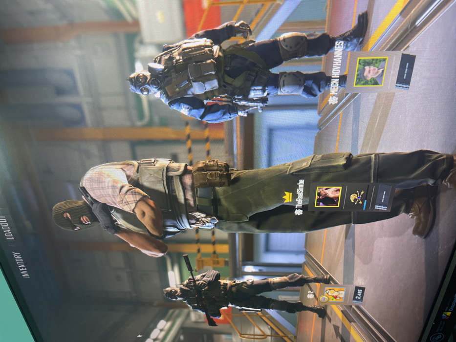 This image is a photograph of a computer monitor displaying a video game interface. The screen presents a character selection or lobby area set within a virtual, futuristic, industrial environment. Three distinct armed tactical characters are positioned on illuminated platforms. The central character is a male figure wearing a dark olive-green balaclava, a plaid long-sleeve shirt (light red, white, and blue checks), an olive-green tactical ballistic vest, olive-green cargo pants, and brown tactical boots. A brown tactical belt with utility pouches and a silver-colored, possibly eagle-shaped, buckle is visible. He holds a dark handgun in his right hand, with the barrel resting on his left shoulder, while his left arm is bent across his chest. A digital overlay beneath him displays "TheRealSimba" with a crown icon and a profile picture depicting a lion cub. To the left, a second male character is clad in dark tactical gear, including a dark helmet, dark goggles, and what appears to be a gas mask or respirator. He wears a dark tactical vest and pants and holds a dark rifle with an attached suppressor, pointed downwards. A digital overlay beneath him shows "#2," a cartoonish icon, and the number "2,485." To the right, a third male character wears a dark blue tactical uniform with a prominent gas mask obscuring his entire face, a tactical vest adorned with pouches, dark blue trousers, and visible knee pads. He holds a dark handgun in his right hand, pointed downwards. A digital overlay beneath him displays "MECN HOVHANNES" with a profile picture of a young man with short dark hair. The virtual environment features metallic flooring, railings, and various industrial structures in the background, including grey walls, support beams, and yellow and black striped caution markings. Distant red and orange elements are also visible. The top left corner of the screen displays "INVENTORY" and "LOADOUT." There are no visual elements within this image content to indicate a specific real-world geographical location, such as the city of Yerevan, Armenia.
