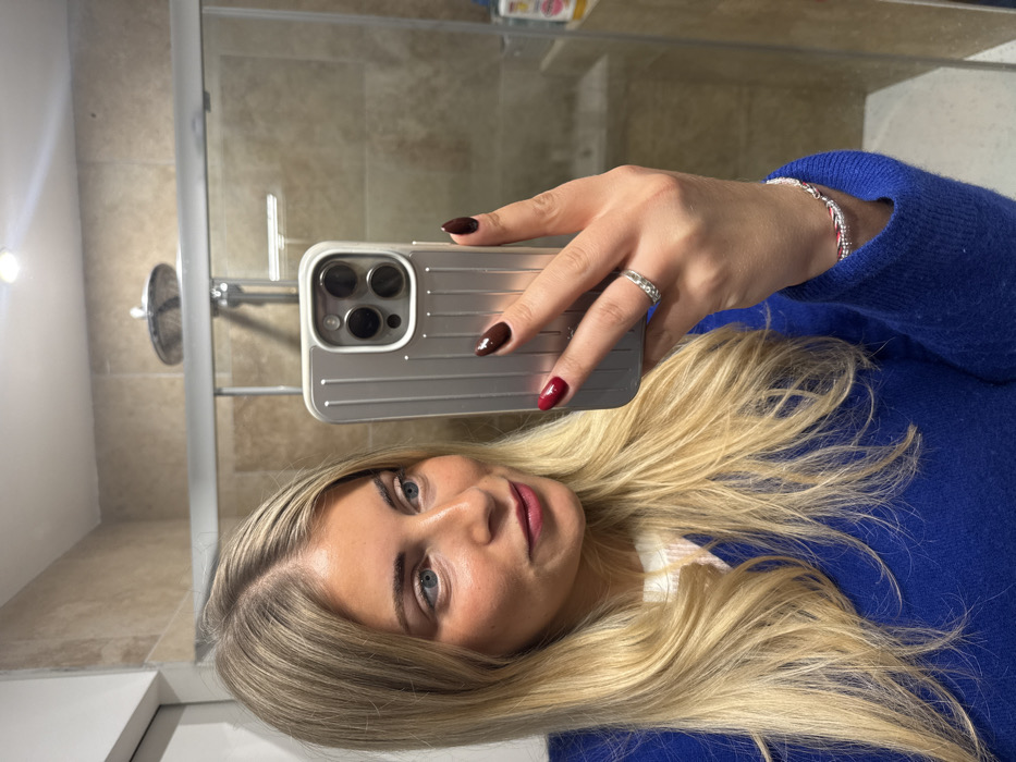 A woman takes a selfie in a bathroom mirror. Her blonde hair cascades over her right shoulder, contrasting with her bright blue sweater. She holds a silver iPhone, displaying polished nails of burgundy and a darker brown. A diamond ring adorns her ring finger, and a silver bracelet graces her wrist. The bathroom features neutral-toned tiles, a showerhead, and toiletries visible on a shelf in the background. The image is rotated counterclockwise.