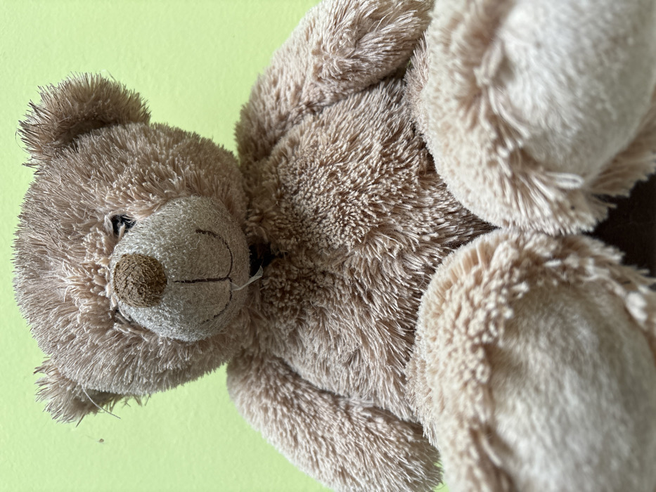 - "A light brown, plush teddy bear is depicted in a close-up, low-angle shot, positioned upright and facing the viewer" by FM-wE9nL2, licensed under CC BY 4.0