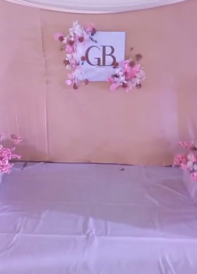interior of a decorated event hall, possibly for a wedding. The camera pans from a backdrop with pink and white flowers and a square plaque with the letters "GB" to a view of tables and chairs covered in white linens. The tables have floral centerpieces. The ceiling is draped with white fabric and adorned with spherical lights. The aisle is covered with a shiny white runner. At the end of the aisle, a man in a red shirt is arranging decorations on the stage. The overall color scheme is white and pastel pink.