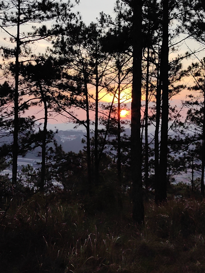 The image depicts a static, outdoor scene at either sunrise or sunset, overlooking the city of Thành phố Đà Lạt, Vietnam. The foreground consists of dark, unidentifiable undergrowth and dry grasses, largely obscured by shadow. The midground is dominated by numerous pine trees, rendered in dark silhouette, with their tall, slender trunks and dense needle foliage forming a vertical screen across the frame. Sunlight filters through gaps in the trees, creating a radiant orange and red sun disk visible slightly right of center. The sky beyond the trees transitions from a vivid orange and red at the horizon, where the sun is located, to lighter orange and then pale grey-blue towards the top of the frame. In the distant background, beyond the immediate treeline, a sprawling urban or semi-urban landscape with numerous structures and buildings is faintly discernible through atmospheric haze, indicating a city or large town, consistent with Thành phố Đà Lạt. No people, animals, or explicit actions or interactions are visible within the frame.