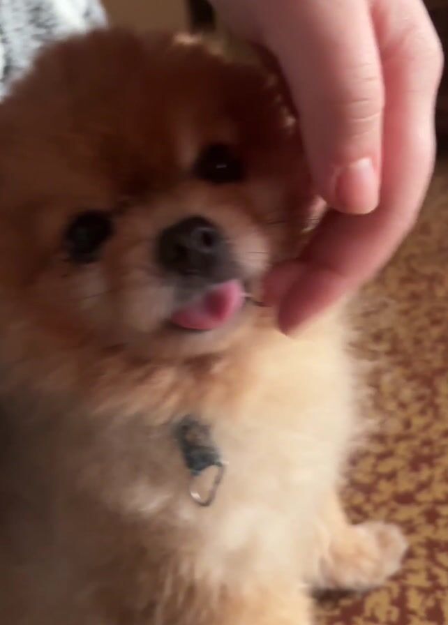A hand pets the head of a small, fluffy Pomeranian dog. The dog is light brown with a blue collar. Its tongue is sticking out. The dog is sitting on a patterned brown carpet. The hand moves away and the dog looks up with its tongue out. The background includes a blanket with white paw prints. The camera angle shifts slightly.