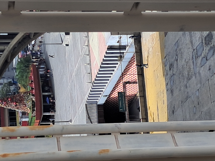Captured from an elevated perspective, the image reveals a cityscape divided by architectural elements. A pedestrian thoroughfare, patterned with light and dark squares, leads toward a subterranean passage marked by signage. Adjacent to it, a building with a patterned red and white facade stands alongside a structure with a worn yellow exterior. The foreground consists of a white, metal barrier, partially obscuring the view of a street lined with shops and pedestrians.