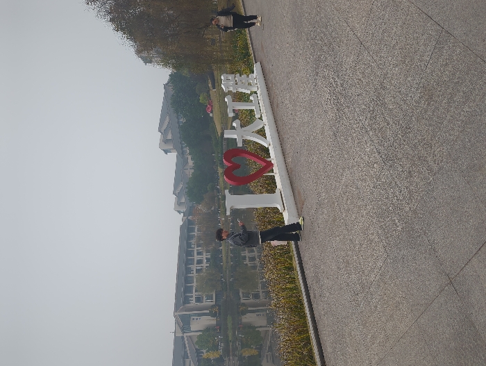 A low-angle shot shows a grey hazy day. An "I [heart] 江大" sign in white and red stands on a gray paved area. A person in dark clothing poses beside the sign. Trees and buildings are visible in the background. The composition is slightly tilted, with the horizon at an angle. The overall scene is urban and appears to be a public space or university campus.