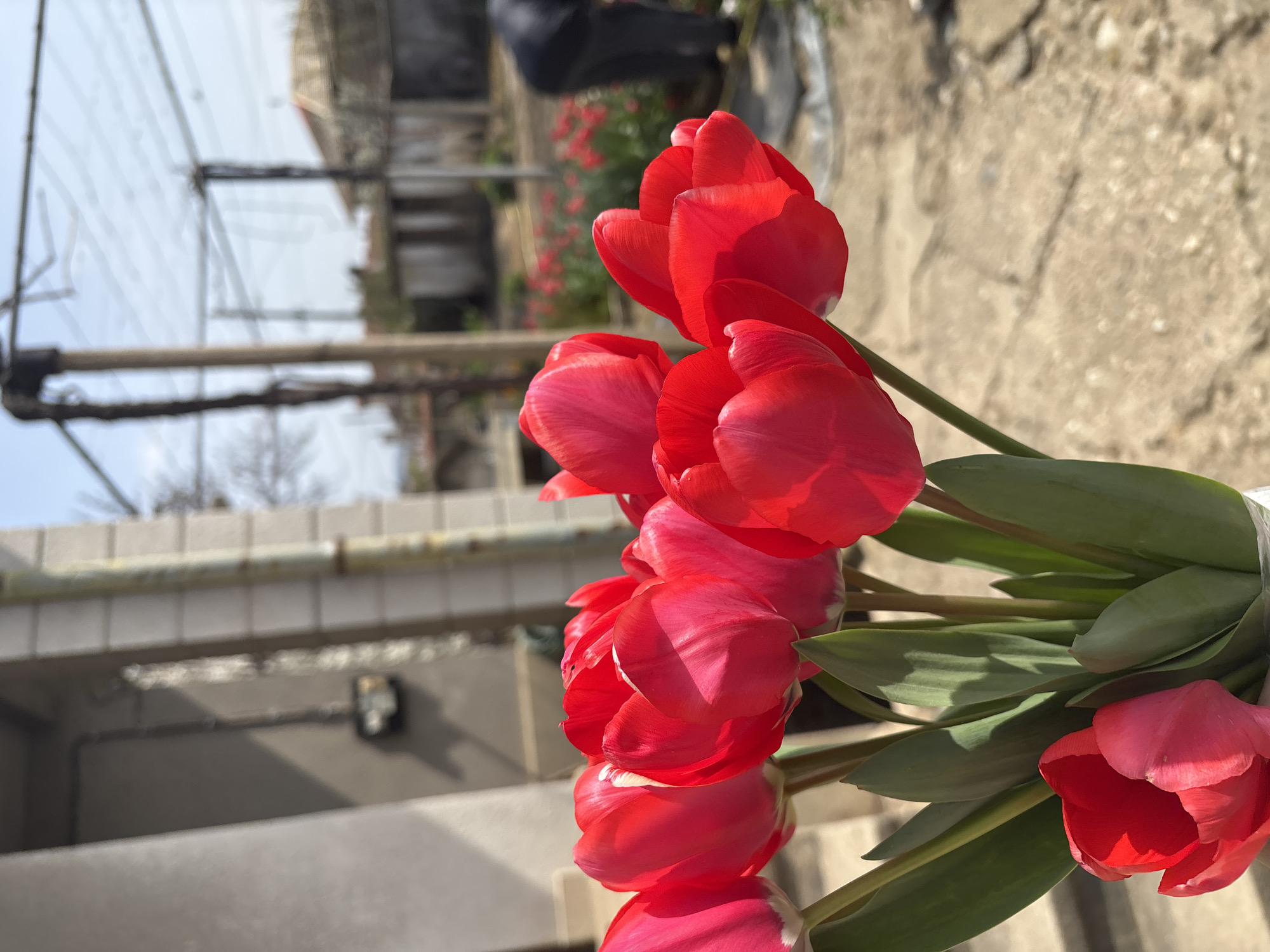 A close-up, slightly angled photograph taken in Banya, Bulgaria, showcases a bouquet of bright red tulips. The flowers dominate the foreground, their petals appearing smooth and slightly translucent in the sunlight. Green stems and leaves are visible amidst the vibrant red blooms. The background features a blurred urban landscape. To the left, a light-colored building with horizontal lines can be seen, possibly a wall or fence. In the upper portion of the image, there are power lines against a pale sky. Further back, near the top of the image, a figure of a person and other buildings are partially visible, adding depth to the scene. The ground appears to be a textured mix of concrete and dirt. The lighting is bright, suggesting a sunny day, with shadows and highlights creating contrast on the tulips and the surrounding environment.