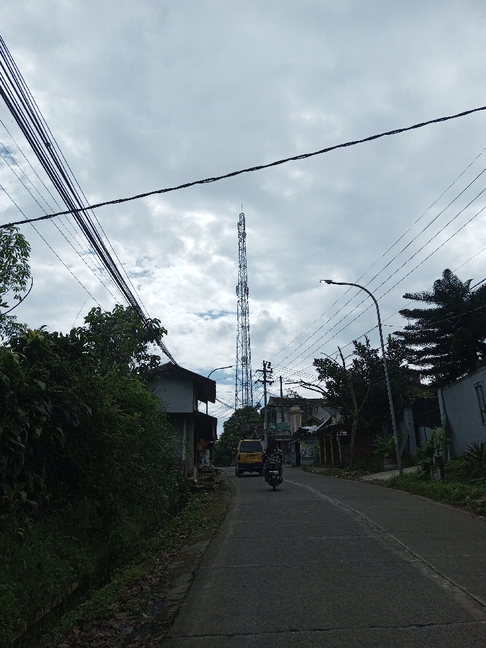 The scene depicts a paved street in Ariyalai, Sri Lanka, under an overcast sky. A tall, lattice-structured cellular communications tower, equipped with multiple antennae, dominates the background, centered down the street. The dark gray paved road recedes towards the tower, curving slightly right. A dark-colored motorcycle, ridden by one individual, is in the midground, traveling away from the viewer. Further down the road, a yellow van is also moving away or parked. On the left, a dense hedge of dark green vegetation lines the immediate roadside, with a narrow drainage ditch at its base. Behind the vegetation, a two-story building with a light facade and dark roof is partially visible. Multiple bundles of black utility lines crisscross the upper left portion of the frame. On the right, a street light with a curved pole and a utility pole supporting numerous overhead wires are present. Several buildings, some appearing residential, line this side of the street. Trees and additional structures are visible in the distance beyond the immediate buildings.
