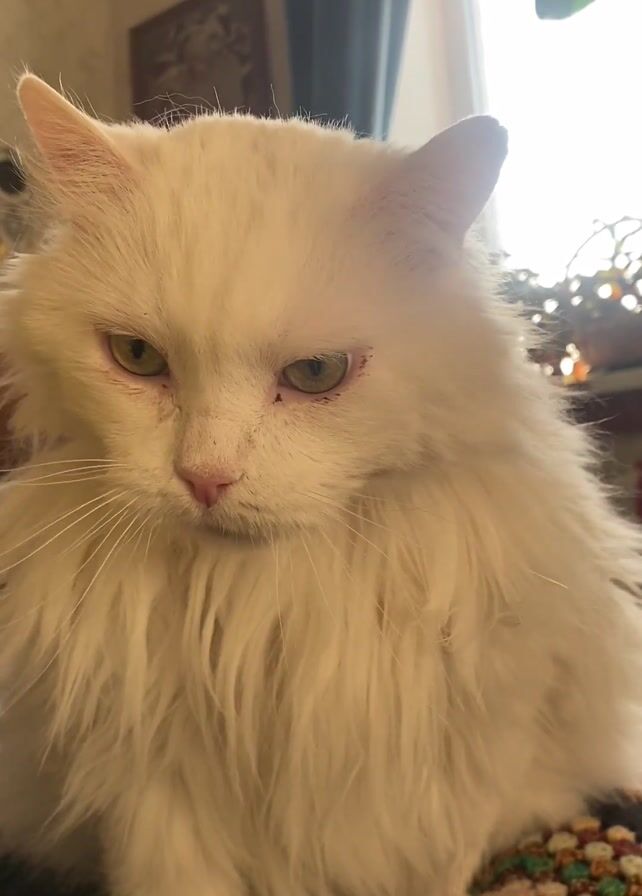 long-haired, white cat sitting on a multicolored crocheted blanket. The cat's eyes are a light yellow-green and it has a pink nose. In the background, there is a window with a blue curtain, a plant on a table, and a framed picture on the wall. The cat is looking downwards and slightly to the left. It meows at the beginning of the video.