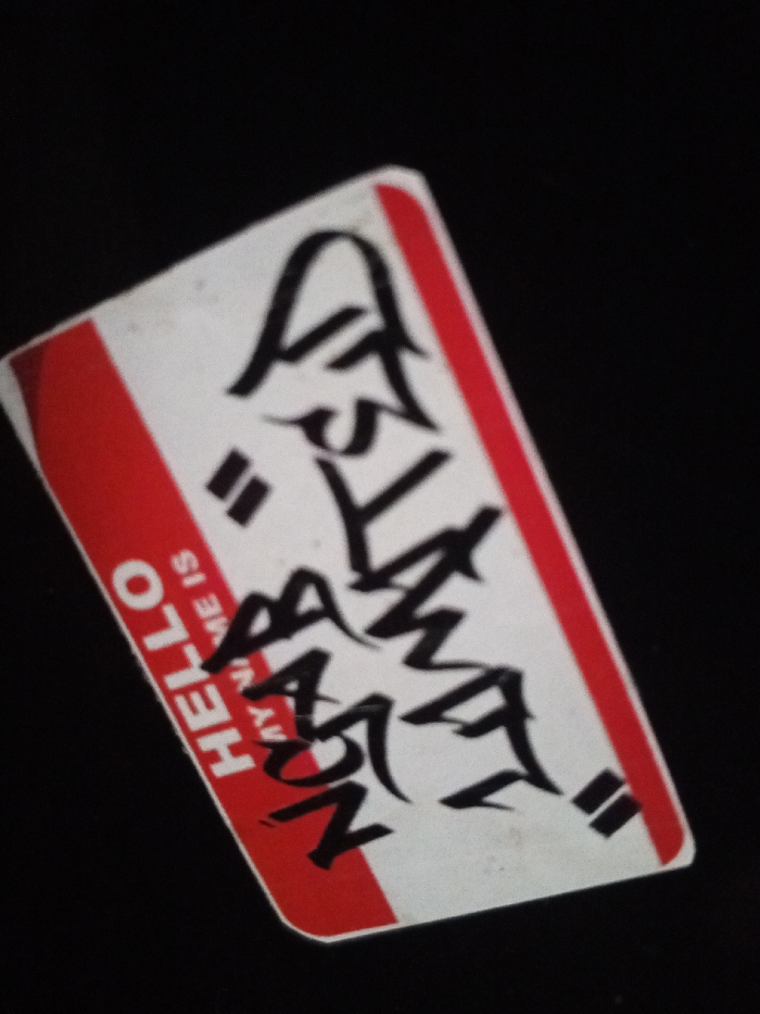 - "A rectangular, white and red "Hello My Name Is" sticker is depicted against a solid black background" by FM-vKsqd2, licensed under CC BY 4.0