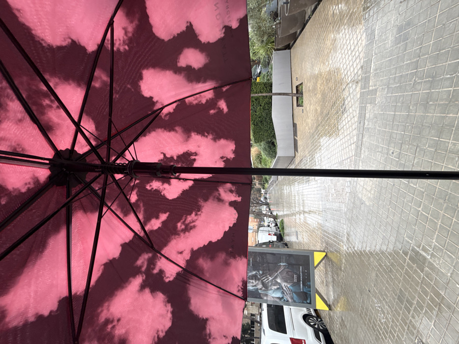 The scene depicts an upward-angled perspective from directly beneath an open dark pink umbrella, patterned with white cloud-like formations on its interior surface. Black metal ribs and a central shaft are visible, along with partial text reading "AND WHAT ARCHIVES" and "BARCELONA" on the canopy. Below the umbrella, a wet, light grey tiled sidewalk extends into the mid-ground, exhibiting reflections of ambient light, indicative of recent rain. To the left, a white van is parked on a street, adjacent to a black A-frame advertising board displaying a movie poster. The poster features a blonde woman holding a baby, with Spanish text "12 FEBRERO SOLO EN CINES" visible. Further down the street, additional parked vehicles and bare-branched trees are visible. To the right, the sidewalk expands into a pedestrian area bordered by modern planters containing green vegetation, a solitary small tree, and the lower facade of a contemporary building. No individuals are present. The environment is an urban setting in Barcelona, Spain, on an overcast day.