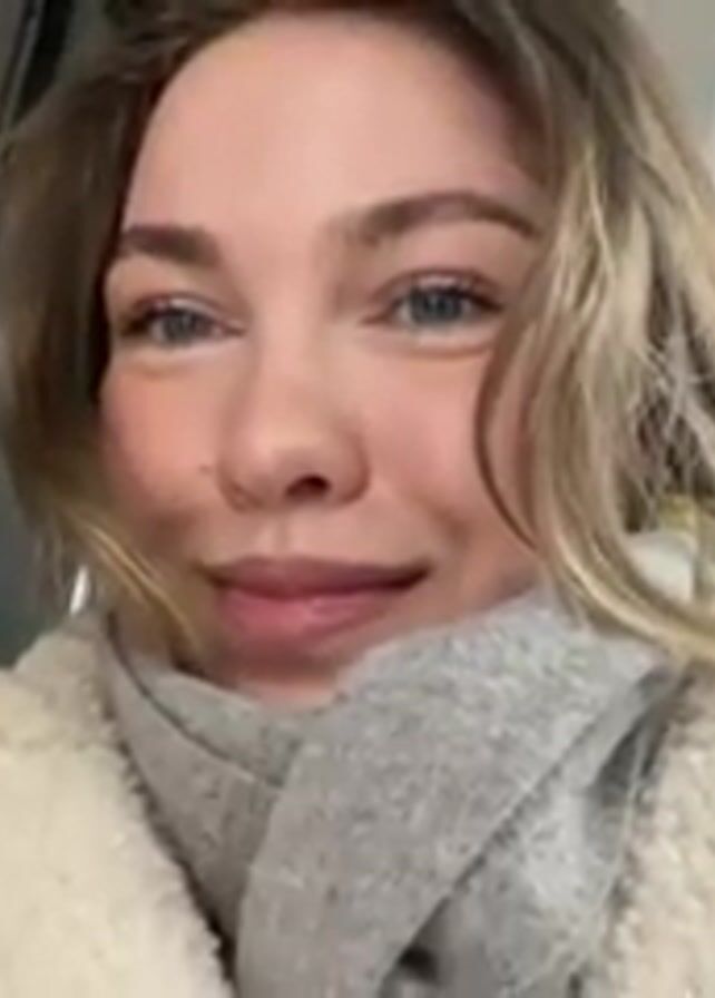 A woman with blonde hair and blue eyes is standing on a train. She is wearing a white fleece jacket and a grey scarf. She looks into the camera and smiles, then she makes a kissing face. Other passengers can be seen in the background. The train is moving, and there are signs in Russian on the train.