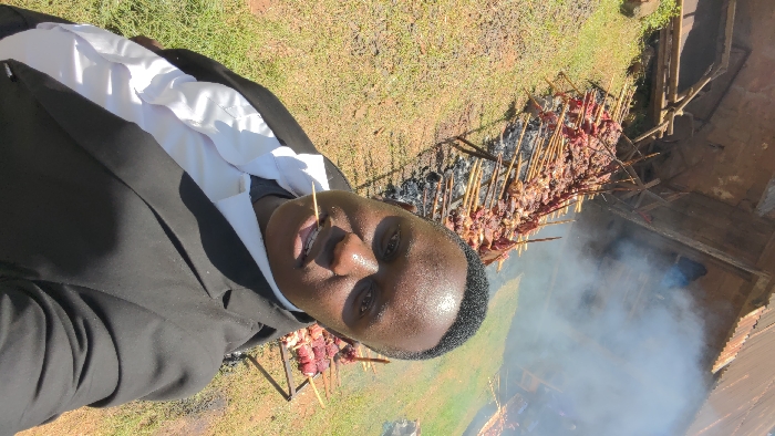 The image depicts a dark-skinned male individual in a close-up, upward-angled selfie, occupying the right foreground. He is wearing a black suit jacket over a white collared shirt and holds a wooden toothpick between his lips. His expression is neutral. In the mid-ground and background, an extensive outdoor grilling operation is underway in Makami Juu, Tanzania. A long line of raw red meat, cut into chunks and skewered on numerous thin wooden sticks, is positioned horizontally over multiple ground-level fires. Significant plumes of white smoke rise from these fires, partially obscuring the scene. The grilling setup appears to utilize simple, possibly makeshift, metal or wooden frames to support the skewers. The ground covering consists of sparse green grass mixed with exposed reddish-brown soil. In the far background, partially visible through the smoke, stands a rustic building with a corrugated metal roof and what appears to be unpainted masonry or concrete walls, with some exposed timber structures.