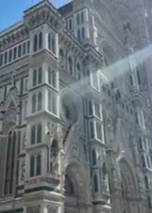 low-angle view of the Florence Cathedral in Italy, also known as the Duomo. The camera slowly pans back and slightly to the right, revealing more of the cathedral's exterior and the surrounding buildings. The cathedral is made of marble with alternating bands of white and green. The facade is highly decorated with architectural details, including windows, arches, and sculptures. The sky is blue with a few wispy clouds, and the sun is shining brightly, causing some glare. There are a few signs of modern urban life in the surrounding area, including buildings and possibly a canopy tent, but the focus remains on the cathedral.