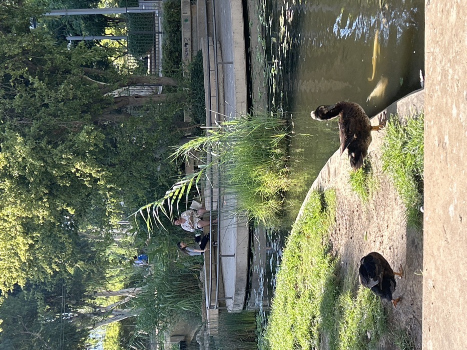 The image depicts a daytime scene within Yarkon Park (Ganei Yehoshua) in Tel Aviv, Israel, alongside a section of the Yarkon River or a connected pond. In the foreground, a concrete ledge gives way to a grassy bank. Two ducks are positioned on this bank: a dark brown duck with a white crested head stands near the water's edge, facing left, while a smaller, darker duck is further back on the grass, facing away from the water. The body of water, characterized by its dark surface, features several lily pads and at least two visible light-colored fish (likely carp or koi) swimming beneath the surface. Extending into the water from the far bank is a circular concrete platform, equipped with a gray metal railing. Seated on the edge of this platform are two females. The individual on the left has dark hair, wears a light-colored top and dark pants, and is oriented towards the person on her right. The individual on the right has lighter hair, wears a light-colored top, and holds an object in her hands, appearing to be engaged in a leisure activity such as knitting or crafting. They appear to be interacting. Behind the platform, a series of concrete steps ascends. The background is dominated by dense green vegetation, including tall reeds bordering the water and numerous large, leafy trees. A dark metal fence is partially visible in the upper right background, beyond the trees. The scene is brightly illuminated by natural sunlight, casting distinct shadows.