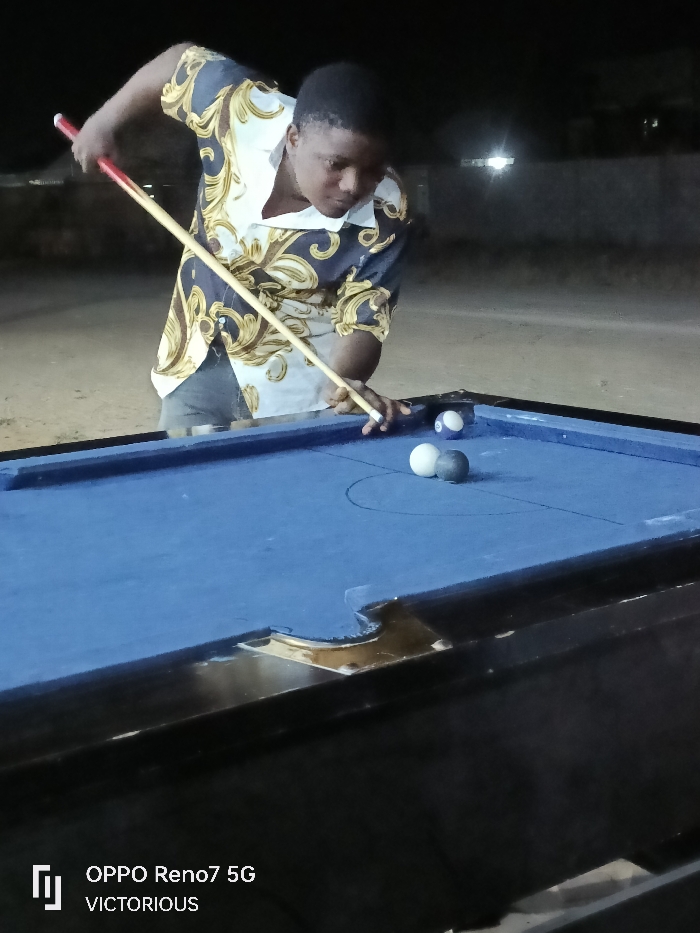 A person in a patterned shirt plays billiards. They hold a cue stick, aiming at the billiard balls on a blue table. Three balls are visible near a corner pocket. The scene is dimly lit, possibly outdoors. The image includes a watermark from an OPPO Reno7 5G phone.
