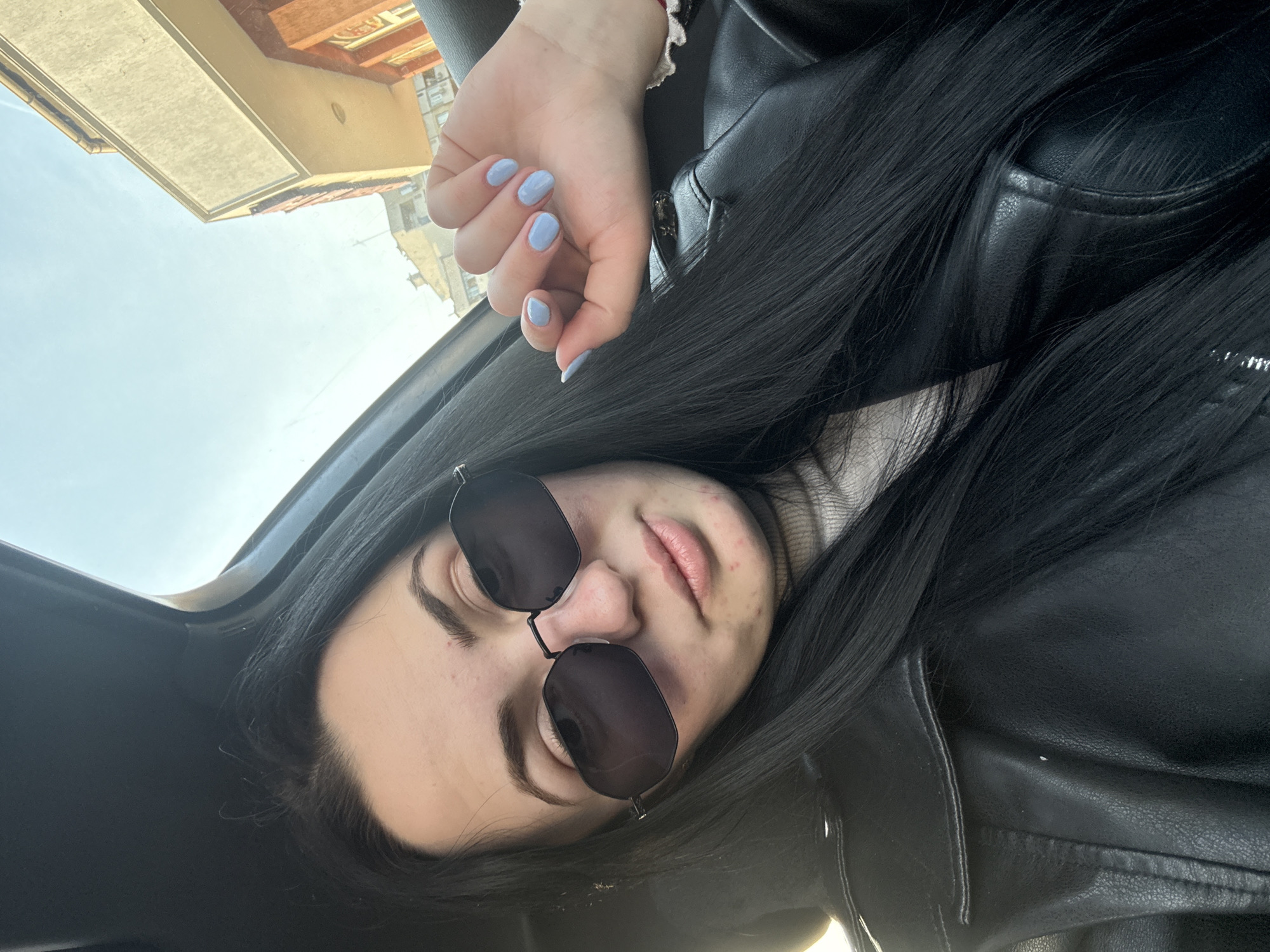 A young adult female is depicted in a close-up, high-angle selfie photograph taken from inside a vehicle. She has long, dark, straight hair, parted on the left side, extending over her shoulders. She wears dark, hexagonal-framed sunglasses, a light-colored turtleneck sweater, and a black leather-like jacket. Visible skin blemishes are present on her chin and forehead. Her left hand, with light blue fingernail polish and a white ruffled cuff on her wrist, is raised and positioned near her neck. The vehicle's dark interior roof lining and window frame are visible. Through the vehicle's window, an urban street scene in Yambol, Bulgaria, is visible under a clear blue sky. The background includes multi-story buildings with light-colored and reddish-brown facades.