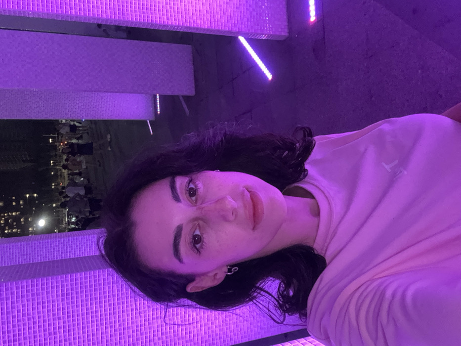 A young adult female is depicted in a close-up selfie, illuminated predominantly by intense purple light