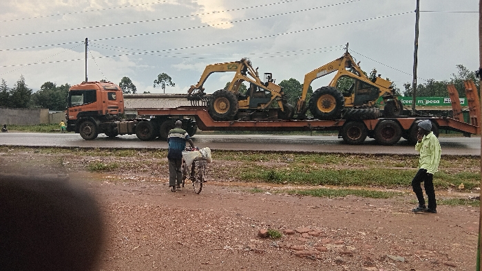 This image depicts a daytime scene in Chevaywa ward, Kenya, under an overcast sky, possibly after rain, indicated by damp ground. The primary subject is a large, orange, multi-axle semi-truck hauling a lowboy trailer on a paved road that appears wet in sections. The trailer transports two prominent yellow heavy machinery units, identified as log loaders or forwarders, each equipped with large tires and a grapple attachment. In the immediate foreground, a reddish-brown dirt shoulder shows patches of green grass and small puddles. Two male individuals are present on this shoulder. On the left, a man viewed from behind, wearing a striped shirt and dark trousers, pushes a bicycle laden with white-wrapped cargo, moving from left to right. On the right, a man wearing a light yellow/lime green shirt, dark trousers, and a dark beanie stands, holding a mobile phone to his ear, seemingly engaged in a conversation. In the background, on the left, a concrete wall and distant green trees are visible, with a small, indistinct figure near the wall. On the right, a utility pole and a green sign bearing the text "Safaricom M-Pesa" are discernible. Overhead, multiple power lines traverse the frame horizontally.