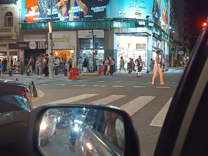 A nighttime street scene viewed from inside a car. Pedestrians are crossing a zebra crossing in front of shops with brightly lit signs. One person is mid-stride across the street. A traffic light is visible in the upper right. The car's side mirror reflects other vehicles with illuminated headlights. The car's interior and side panel frame the right side of the image.