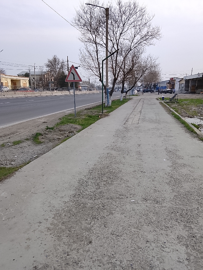 The image presents an urban roadside scene in the city of Syrdarya, Uzbekistan, under an overcast sky. In the foreground, a worn concrete sidewalk extends diagonally towards the background. To the immediate left of the sidewalk is a narrow strip of dirt interspersed with sparse green grass. Adjacent to this strip runs a multi-lane asphalt road, separated from the dirt by a low curb and bordered by concrete median barriers further down. A triangular white road sign with a red border and a black arrow indicating a left curve is positioned between the dirt strip and the road. Along the right side of the sidewalk, several bare deciduous trees, their lower trunks painted white, line the path. A utility pole with a green-arm-mounted streetlight stands near the sidewalk. Further along the sidewalk, a rectangular section of tactile paving is embedded. To the right of the sidewalk and further into the midground, a metal frame structure, possibly a bench or bicycle rack, is visible. Beyond this, a series of single-story commercial buildings with various storefronts and corrugated roofs line the street. Multiple vehicles are visible on the road and parked near the buildings in the midground and background. A few indistinct human figures are present near the commercial buildings on the right side of the scene. The background consists of additional buildings, utility poles, and trees under a uniformly grey sky.