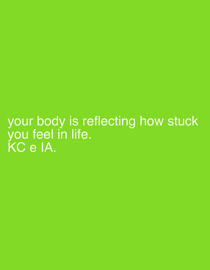 The image features white text on a bright green background. The text reads, "your body is reflecting how stuck you feel in life." Below this sentence is "KC e IA". The font is simple and sans-serif, emphasizing the message against the eye-catching green backdrop. The overall composition is clean and direct.