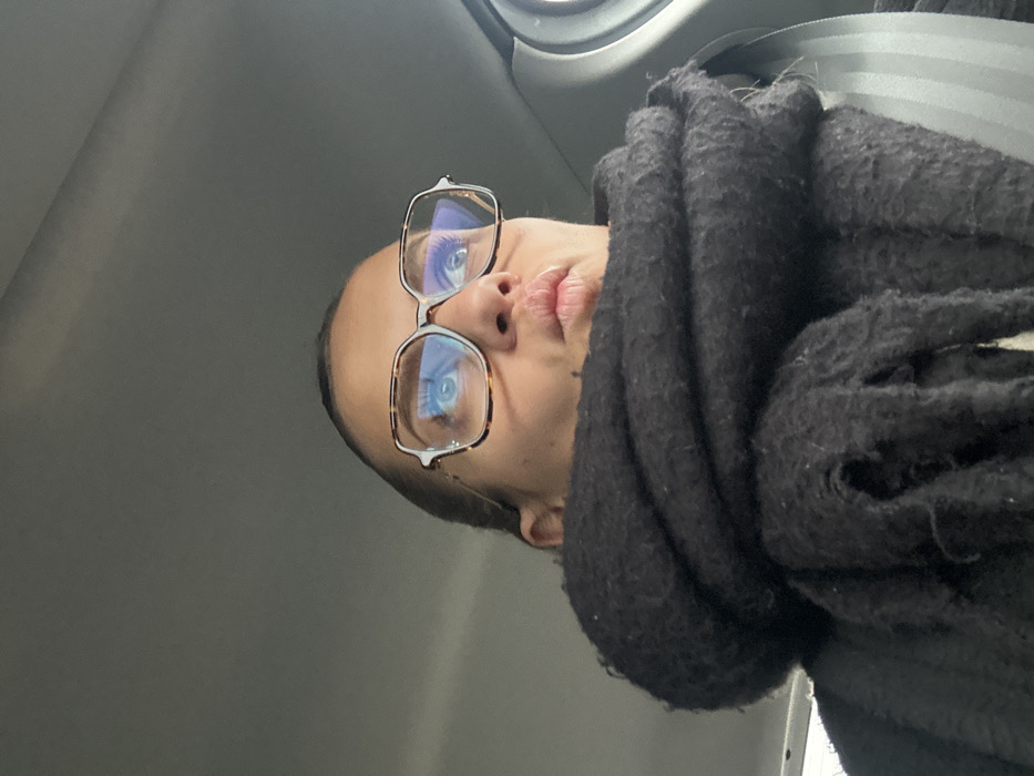 A person wearing large glasses is angled towards the camera. They are wearing a thick, black, textured scarf or garment wrapped around their neck. The person has light skin, small lips, and their eyes are visible through the lenses of their glasses. The background appears to be the interior of a car, with a seatbelt visible. The lighting is soft and diffused.
