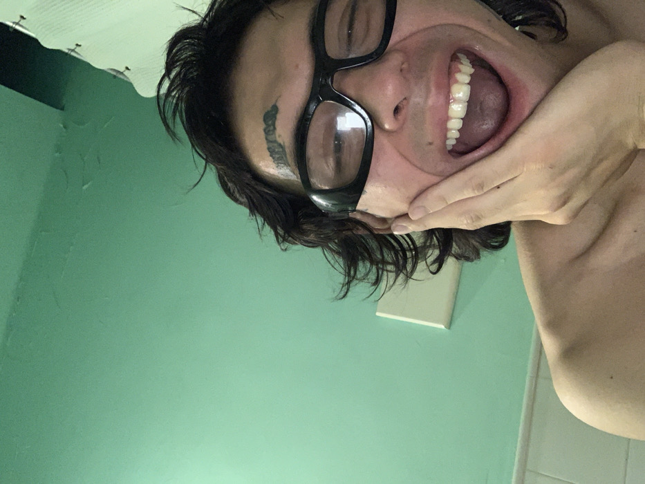 The image presents a close-up, front-facing portrait of an individual, likely an adult male, with dark, wavy hair. The subject wears black, thick-rimmed rectangular eyeglasses. A tattoo displaying the word "vampiro" is visible on the forehead, superior to the left eyebrow. The subject's mouth is wide open, revealing the tongue and both upper and lower teeth, indicative of a strong emotional expression, possibly laughter or a shout. The right hand (viewer's left) is positioned against the right side of the face, covering the jawline and lower cheek. The left shoulder is exposed, suggesting the absence of an upper garment. The background is a uniformly light green wall, exhibiting minor textural irregularities. A light-colored, rectangular electrical outlet or switch plate is affixed to the wall, positioned behind the subject's left side. Illumination is direct and even. The image contains no specific visual data to determine a precise location within Buenos Aires, Argentina.