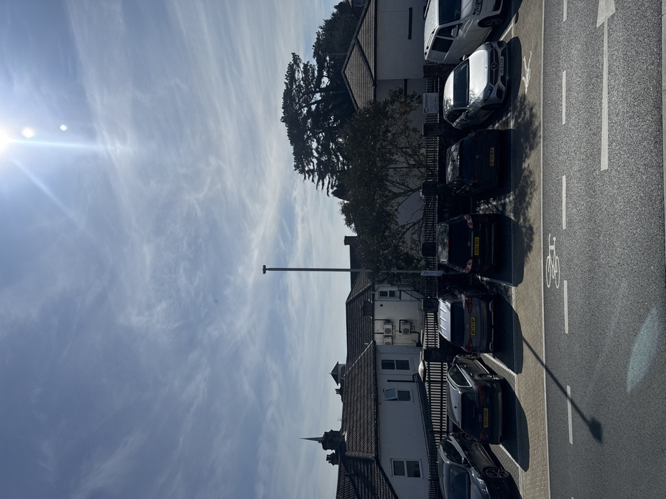 The image depicts a sunlit urban scene in Salisbury, United Kingdom, featuring a parking area, buildings, and sky. The upper portion of the frame shows a bright blue sky with sparse, wispy cirrus clouds. The sun is visible in the upper right quadrant, emitting bright rays and causing lens flare. The midground is dominated by a parking area, where seven vehicles are parked in a row. From left to right, partially obscured, is a dark SUV, followed by a dark Audi Q5 SUV (license plate B27 RNF), a dark grey Nissan Qashqai or similar SUV (license plate WU14 FWP), a dark Hyundai Santa Fe or similar SUV (license plate EO62 RBF), a dark Mercedes-Benz A-Class hatchback (license plate HG20 CXA), a white Mercedes-Benz Sprinter van, and a partially visible dark vehicle on the far right. Shadows from overhead trees are cast upon several of the parked vehicles. A tall, dark grey streetlamp stands prominently in the center of the parking area, with its shadow extending into the foreground. A dark fence or low wall separates the parking area from the background structures. The background features several two-story buildings with dark tiled roofs and light-colored facades. One building displays multiple external air conditioning units. On the left, above the rooftops, a dark spire or turret is visible, suggesting a church or historic architectural feature. Dense green foliage and large evergreen trees are visible behind the buildings, particularly on the right side of the frame. The foreground consists of an asphalt road surface with white painted markings, including a bicycle lane symbol and demarcation lines for parking or traffic flow. No people or active interactions are visible within the scene. The environment is typical of an urban or suburban setting on a clear day.